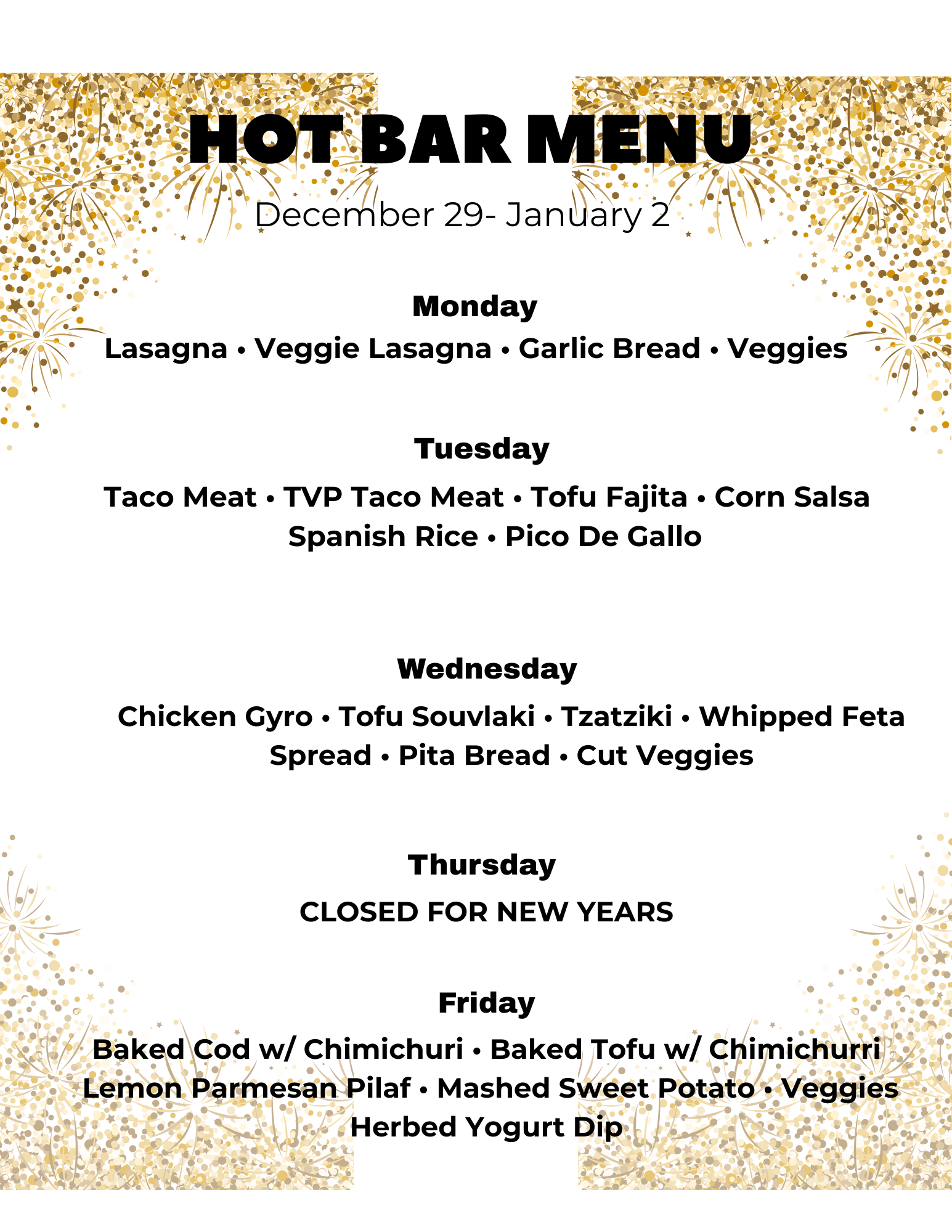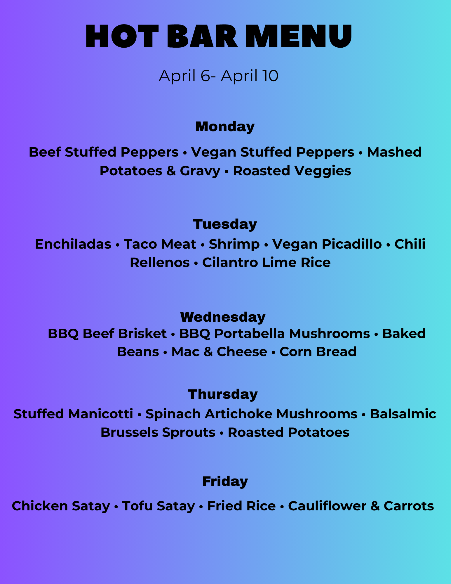 Our hot bar is open Monday-Friday from 11am-6:30pm.